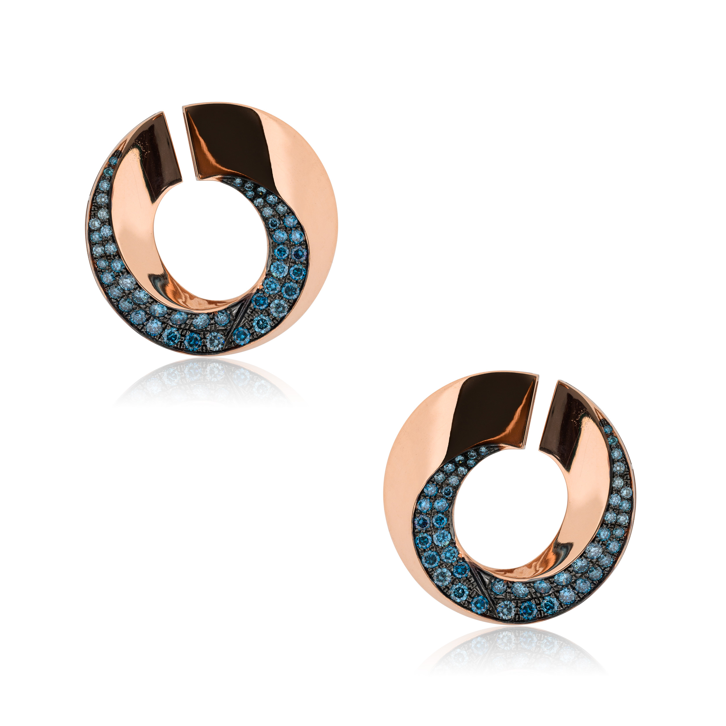 Their circular silhouette embraces the ear, adorned by brilliant-cut blue diamonds, each one capturing the essence of twilight’s most captivating hues.