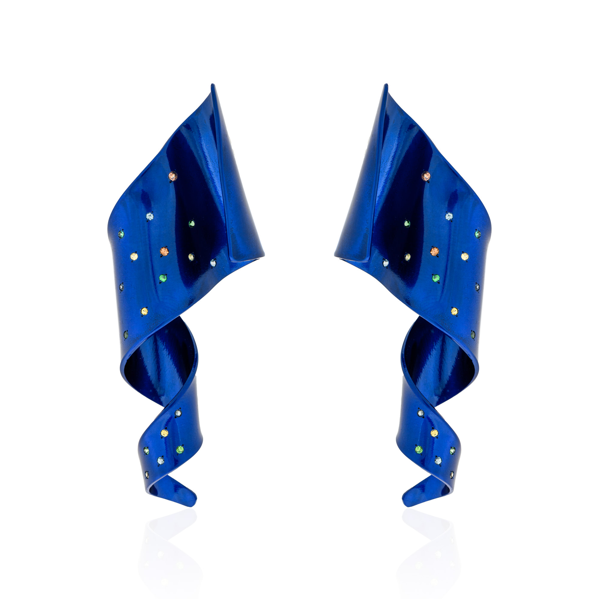 Wear the Cosmic Feather earrings and become the queen of the dancefloor. These earrings are made of coloured titanium with nanoceramic or electrostatic coating, decorated with sapphires and tsavorites and have 18K white gold backs.