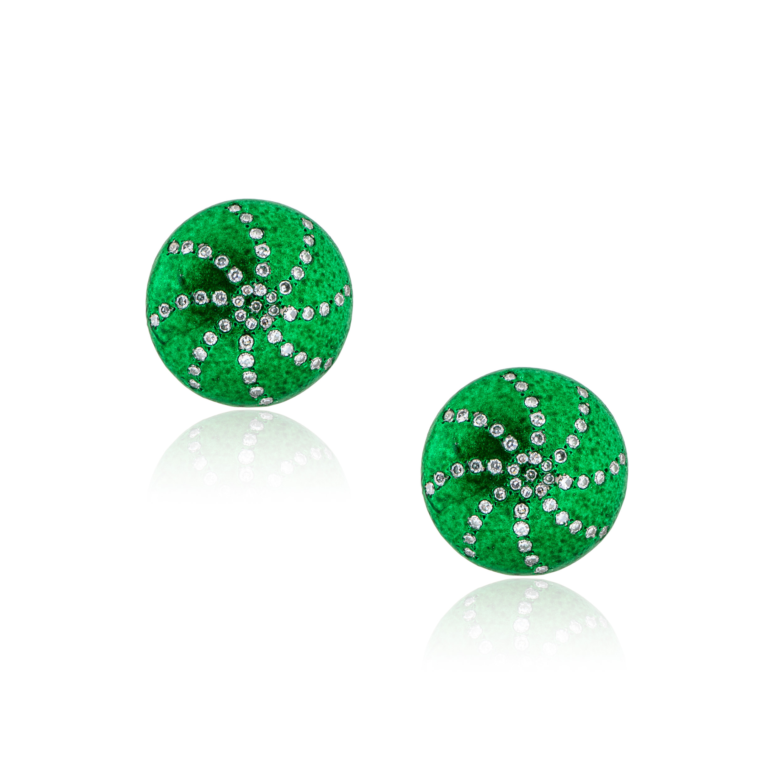 The Sea Urchin Shell Diamond Earrings have 14K yellow gold butterfly backs.