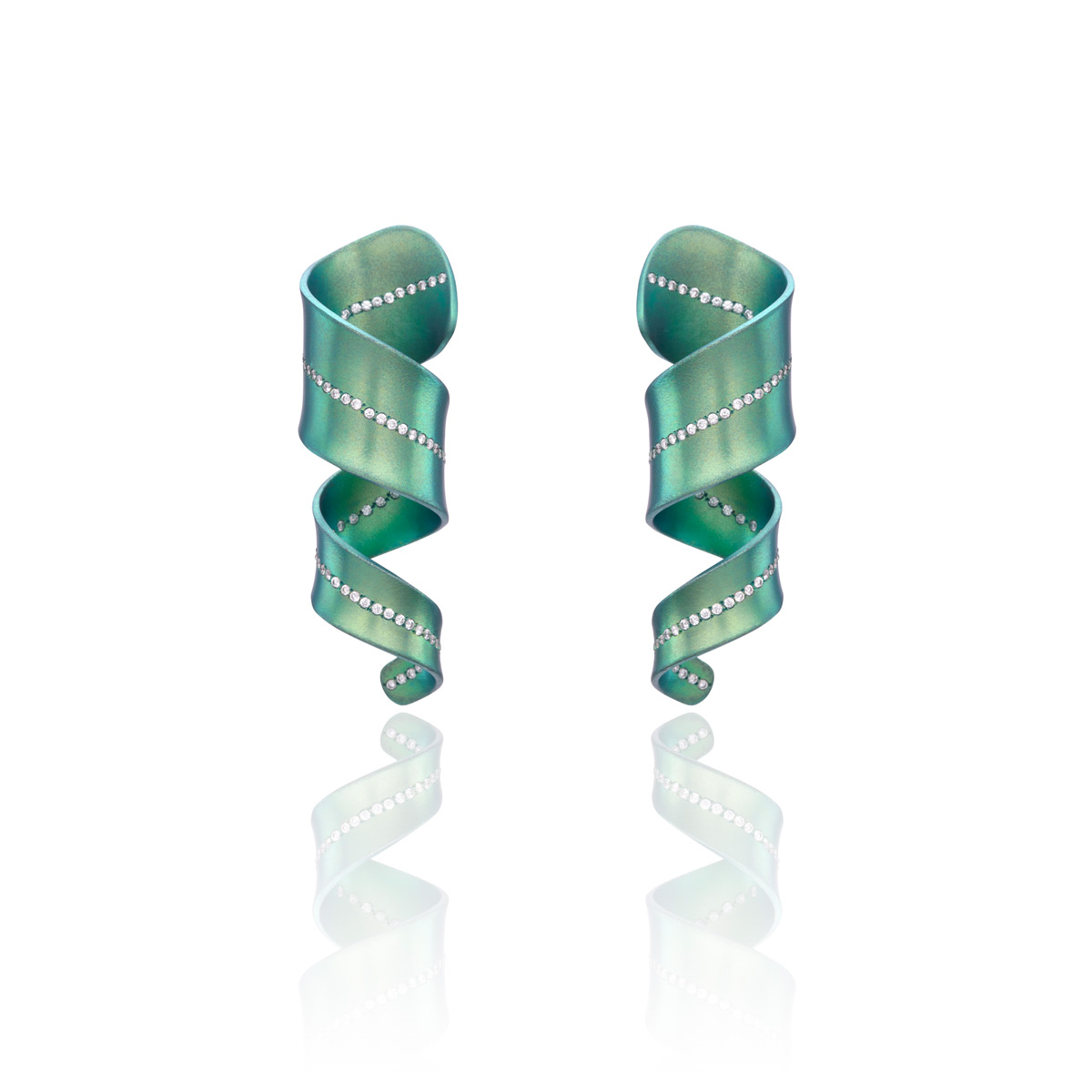 Inspired by the shape of serpentines, this turquoise SerpenTINY pair of earrings will grab your attention. Their playful style, size, colour and materials used, create an extraordinary piece of jewellery. Made of coloured titanium with nanoceramic or electrostatic coating, decorated with diamonds and 18K gold butterfly backs, these earrings will be a great addition to your collection.