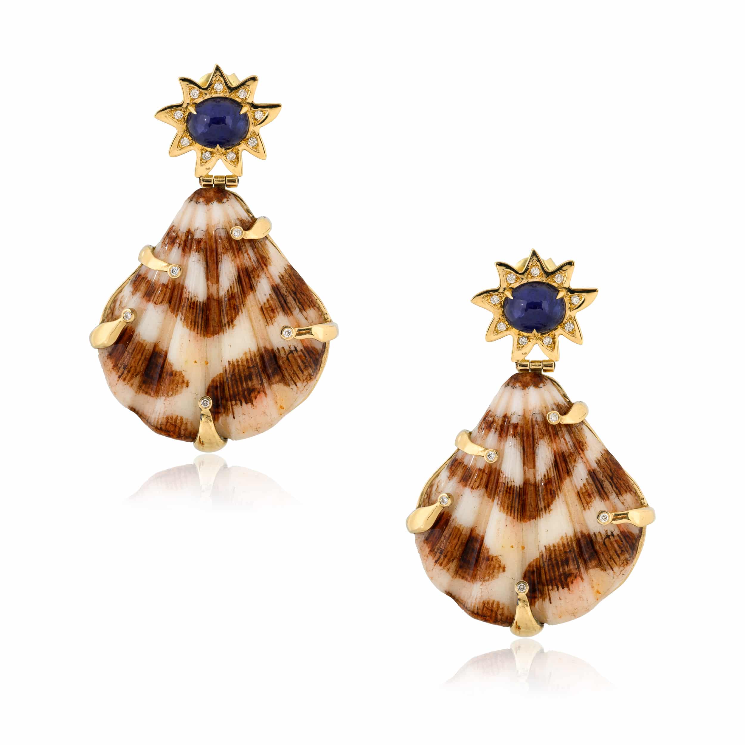 Suspended below, a large natural shell is gently embraced by golden hands, adorned with glistening diamonds.