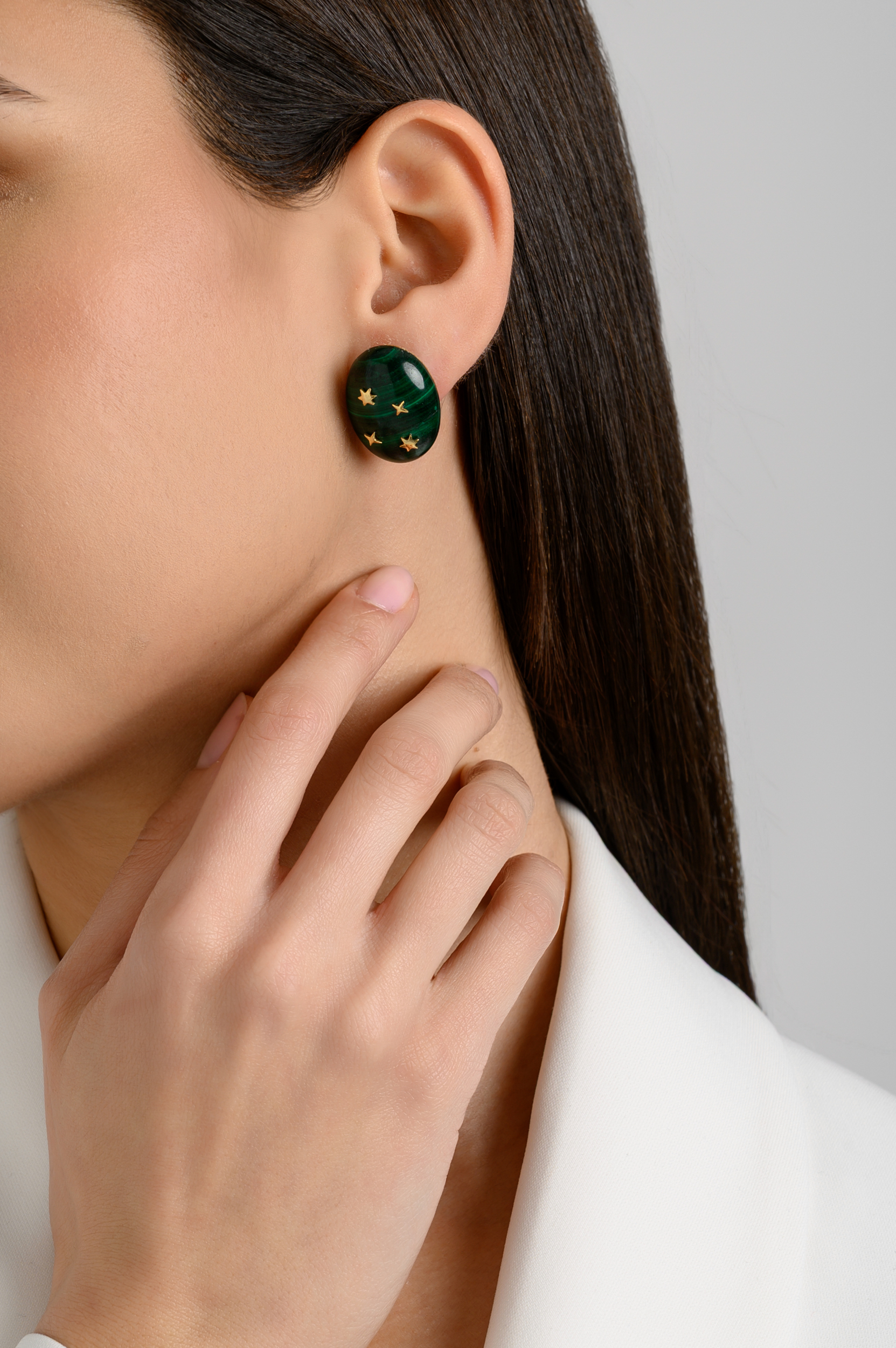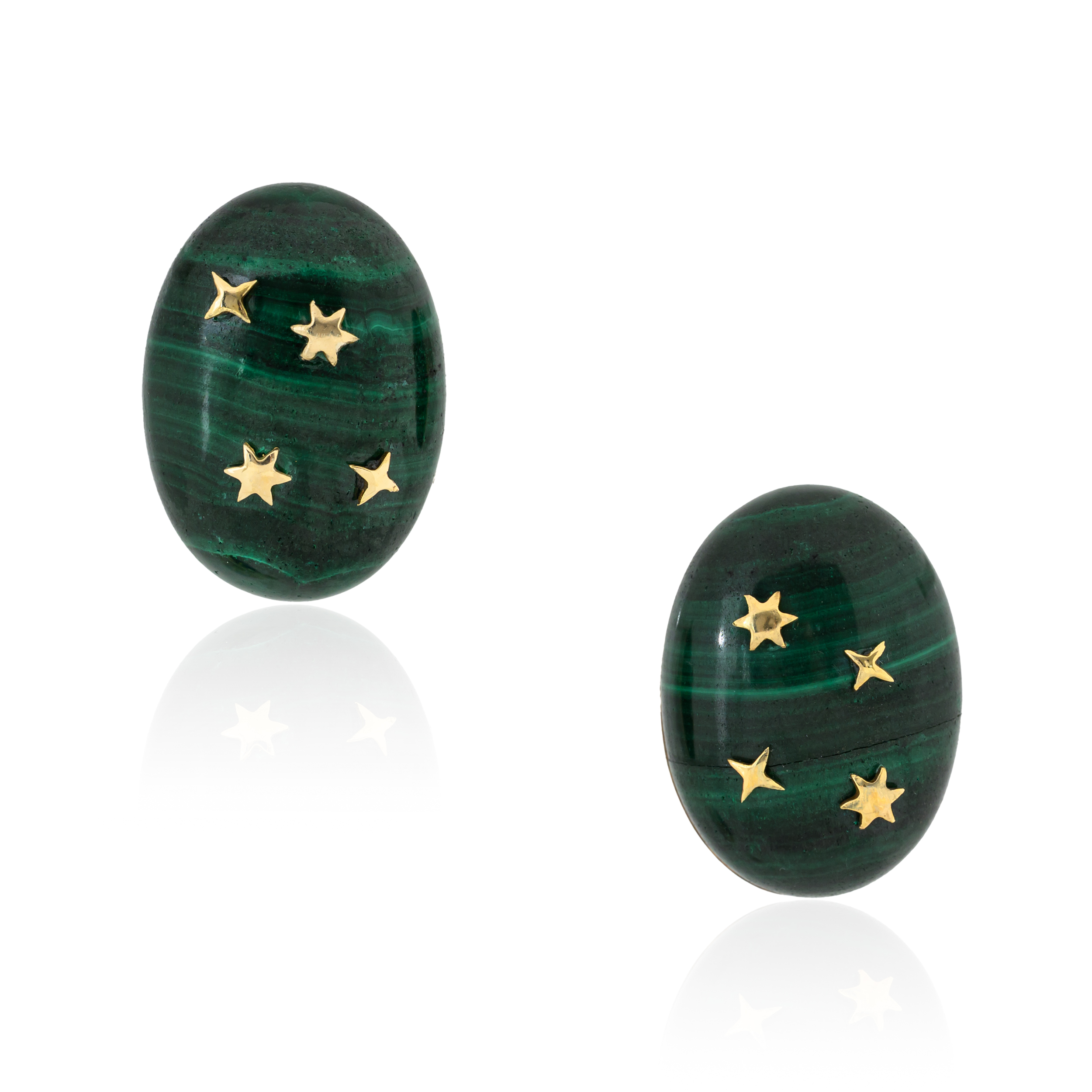 In rich green malachite, swirled with nature’s own patterns, these 9K gold earrings are adorned with golden constellations scattered across their luminous surface.